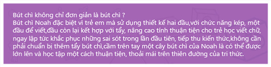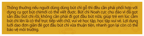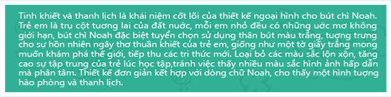 Bút chì Noah được thiết kế riêng cho trẻ em ở giai đoạn mới bắt đầu làm quen với tập viết chữ, sử dụng gỗ tự nhiên, thay thế các thiết kế bút chì bằng nhựa plastic, tránh việc trẻ em do lực nắm k đều hoặc do chất lượng của ngòi bút không đạt mà dẫn đến trường hợp gẫy ngòi bút, bút chì gỗ cũng có thể tránh việc thường xuyên phải bổ sung ngòi bút, thêm vào đó còn có thể dạy trẻ nhỏ tư thế cầm bút, giúp trẻ học cách viết một tay chữ đẹp, cung cấp nền tảng vững chắc cho trẻ mới bắt đầu học.